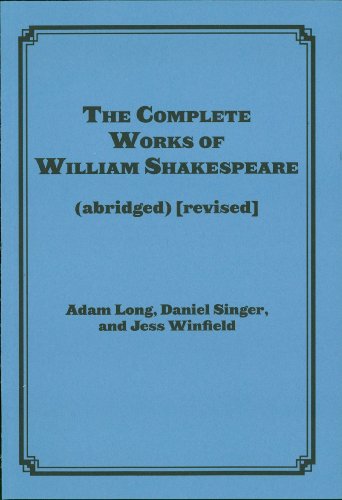 (Applause Books). To celebrate the 20th anniversary of the Reduced Shakespeare Company's classic farce, two of its original writer/performers (Daniel Singer and Jess Winfield) have thoroughly revised the show to bring it up to date for 21st-century audiences, incorporating some of the funniest material from the numerous amateur and professional productions that have been performed around the world. The cultural touchstone that is The Complete Works of William Shakespeare (abridged) was born when three inspired, charismatic comics, having honed their pass-the-hat act at Renaissance fairs, premiered their preposterous masterwork at the Edinburgh Festival Fringe in 1987. It quickly became a worldwide phenomenon, earning the title of London's second-longest-running comedy after a decade at the Criterion Theatre. The Complete Works of William Shakespeare (abridged) is one of the world's most frequently produced plays, and has been translated into several dozen languages. Featured are all 37 of Shakespeare's plays, meant to be performed in 97 minutes, by three actors. Fast paced, witty, and physical, it's full of laughter for Shakespeare lovers and haters alike.(Applause Books). To celebrate the 20th anniversary of the Reduced Shakespeare Company's classic farce, two of its original writer/performers (Daniel Singer and Jess Winfield) have thoroughly revised the show to bring it up to date for 21st-century audiences, incorporating some of the funniest material from the numerous amateur and professional productions that have been performed around the world. The cultural touchstone that is The Complete Works of William Shakespeare (abridged) was born when three inspired, charismatic comics, having honed their pass-the-hat act at Renaissance fairs, premiered their preposterous masterwork at the Edinburgh Festival Fringe in 1987. It quickly became a worldwide phenomenon, earning the title of London's second-longest-running comedy after a decade at the Criterion Theatre. The Complete Works of William Shakespeare (abridged) is one of the world's most frequently produced plays, and has been translated into several dozen languages. Featured are all 37 of Shakespeare's plays, meant to be performed in 97 minutes, by three actors. Fast paced, witty, and physical, it's full of laughter for Shakespeare lovers and haters alike. .
